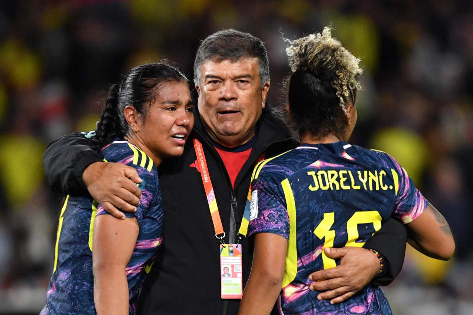 El técnico de la Selección Colombia Femenina, Nelson Abadía, consuela a Daniela Arias y a Jorelyn Carabalí, después de perder 2-1 con Inglaterra en el Mundial de Australia y Nueva Zelanda. La Selección quedó eliminada, llegó hasta cuartos, pero hizo su mejor presentación en tres participaciones.