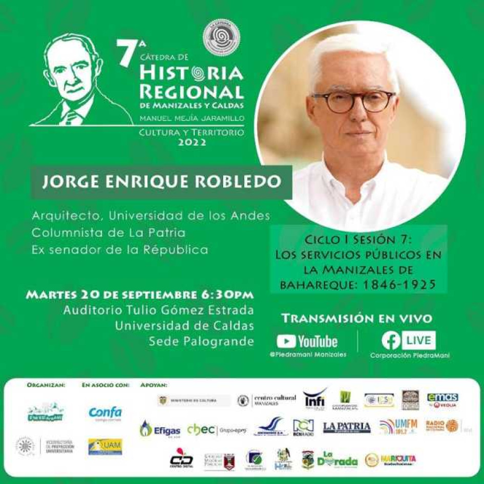 Manizales. El arquitecto y exsenador Jorge Enrique Robledo será el conferencista hoy en la séptima sesión de la Cátedra de Historia Regional. Hablará acerca de los servicios públicos en la Manizales de bahareque, a partir de las 6:30 p.m. en el auditorio Tulio Gómez, de la U. de Caldas.